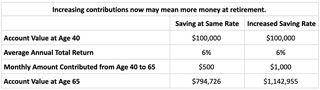 Once you decide to ramp up your efforts, you will want to create a plan for increasing contributions to your retirement savings. Increasing your contribution by even a small amount potentially can have a big impact on your account value. You still could have several years left to accumulate money in your employer retirement plan account. And the sooner you start saving more for retirement, the more time your money will have to benefit from potential compounding: